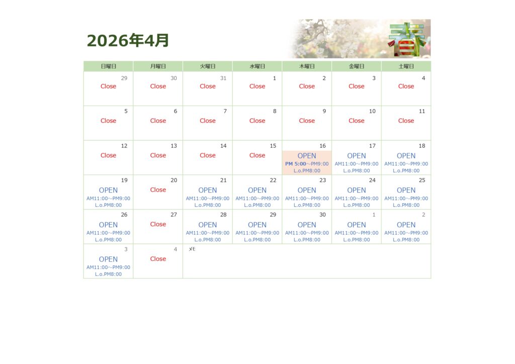 4月16日(木):PM 5:00 〜 PM 9:00(L.O. PM 8:00)